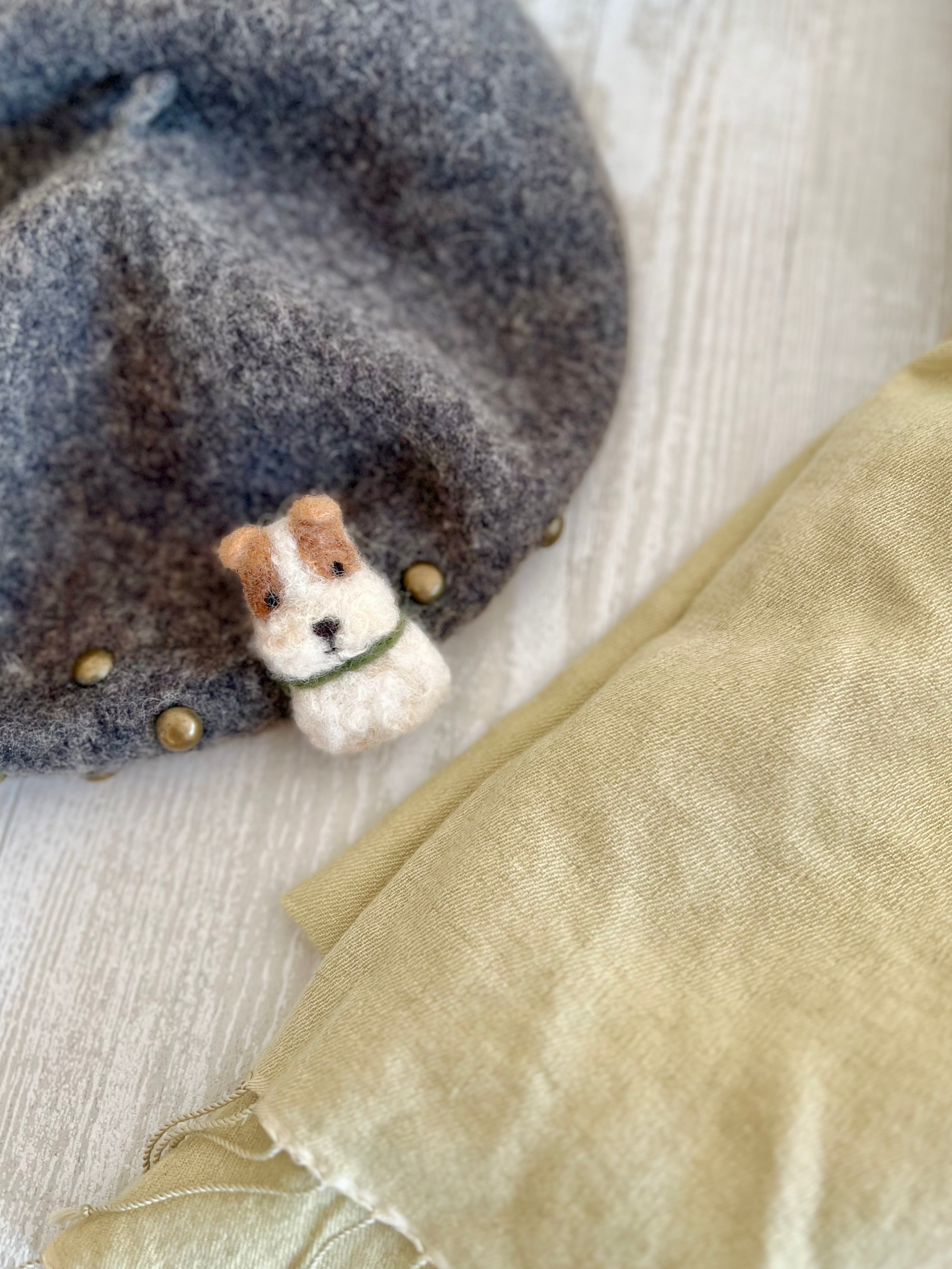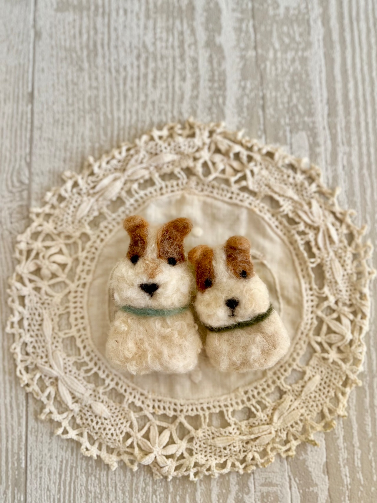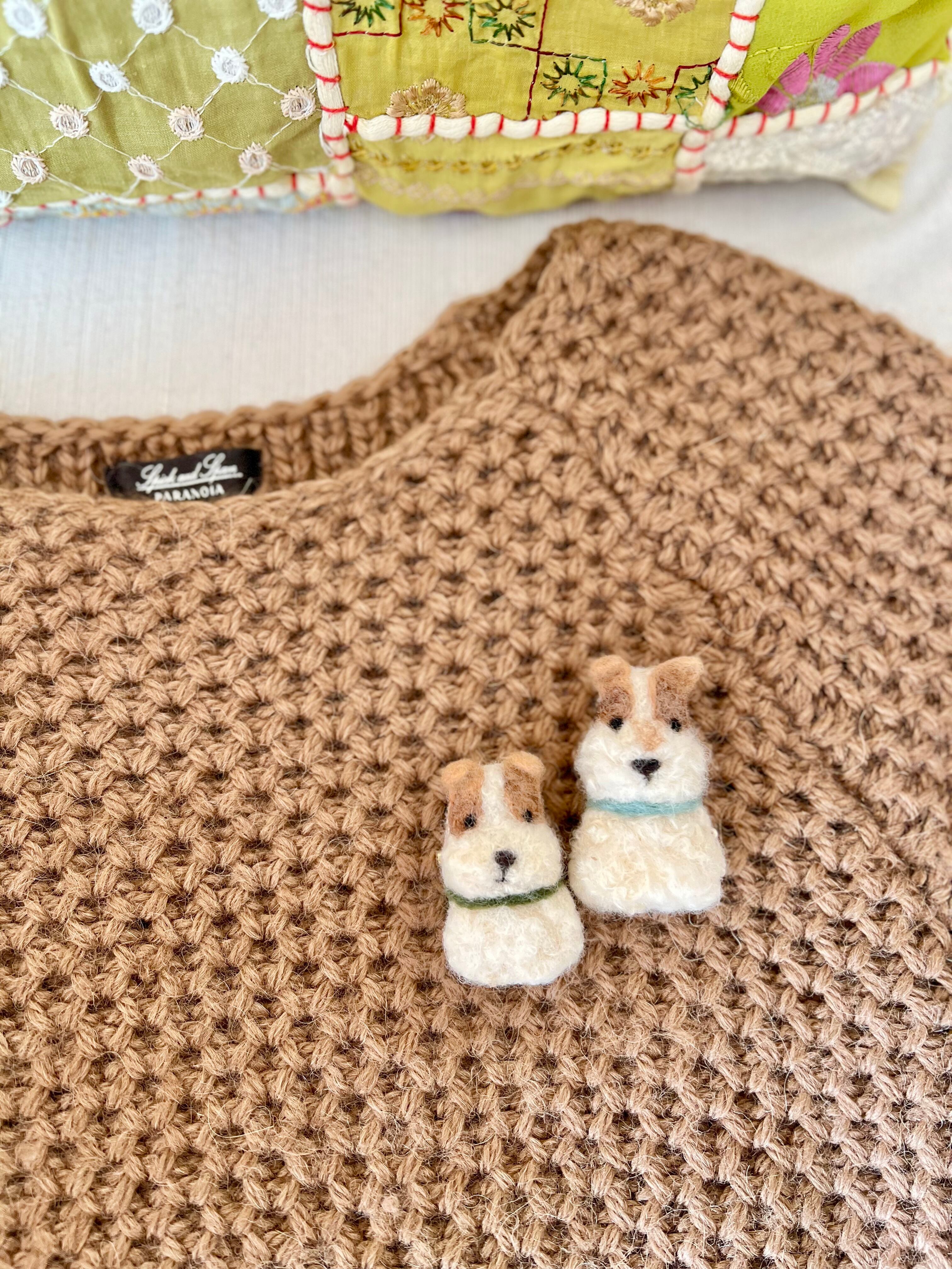 羊の原毛の繊細なカールとナチュラルな色合いをそのまま活かして生まれた犬のブローチです。