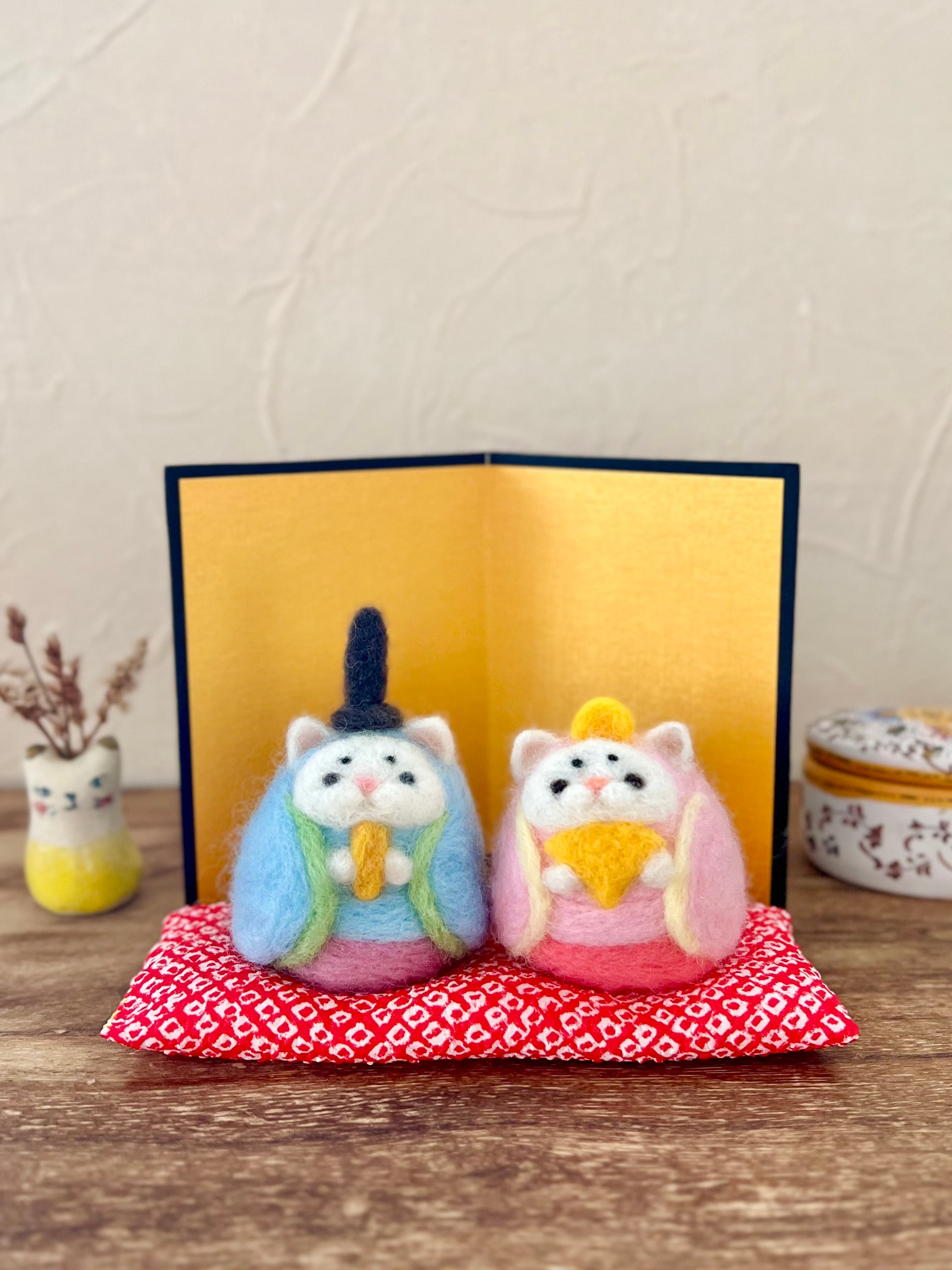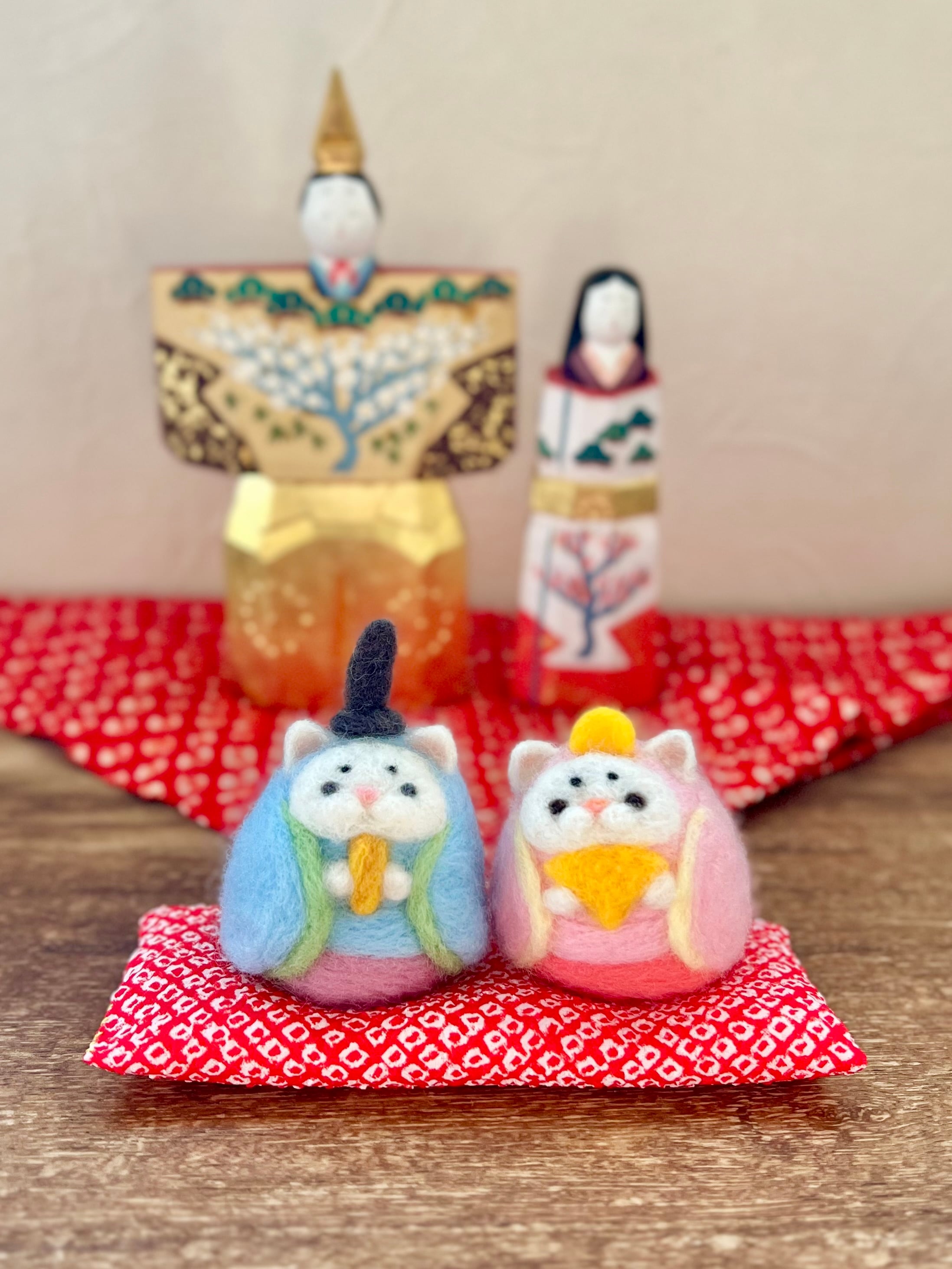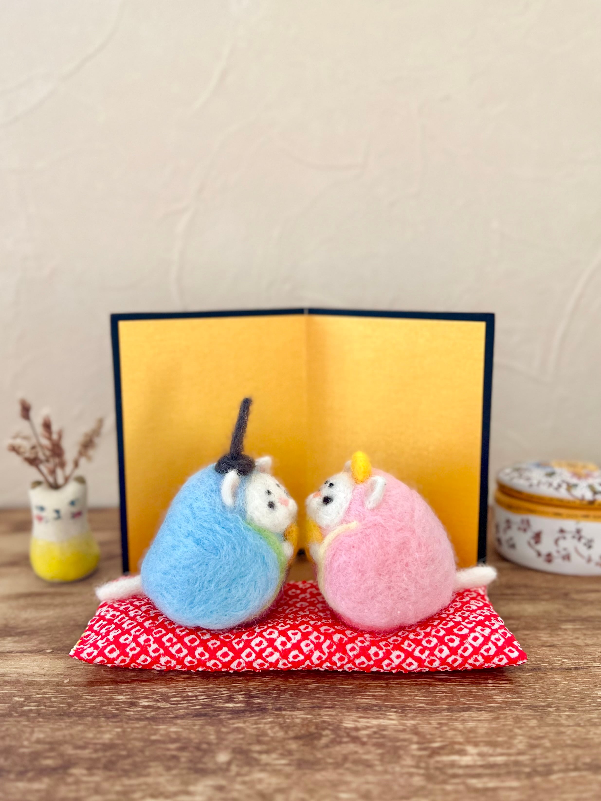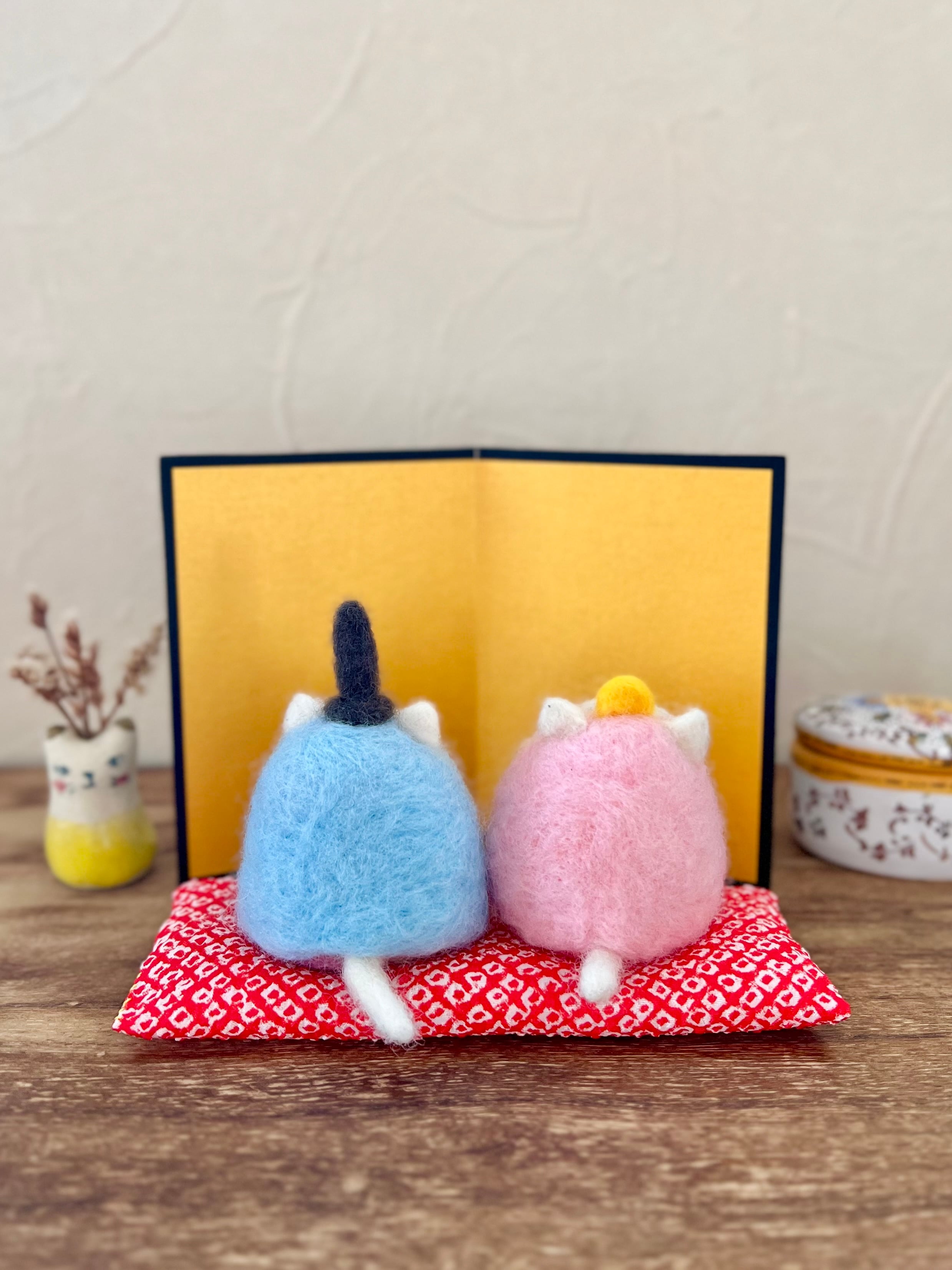 天然の羊毛で作った猫の雛人形です。